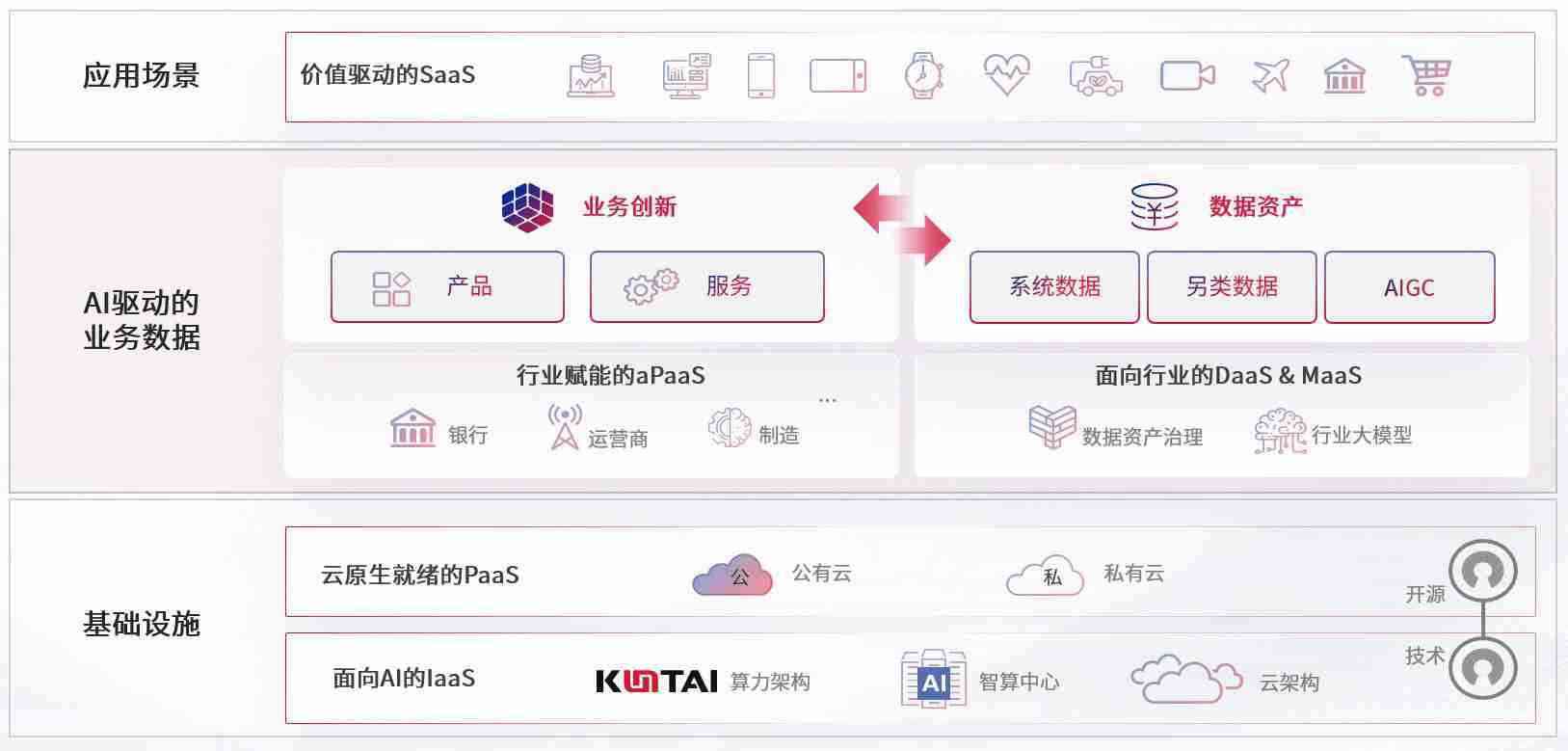 在基础设施层面,,基于商业或开源的云原生就绪开发工具与技术组件(PaaS)和面向AI的底层公共基础设施资源(IaaS),,,将共同支撑企业完成数字化转型