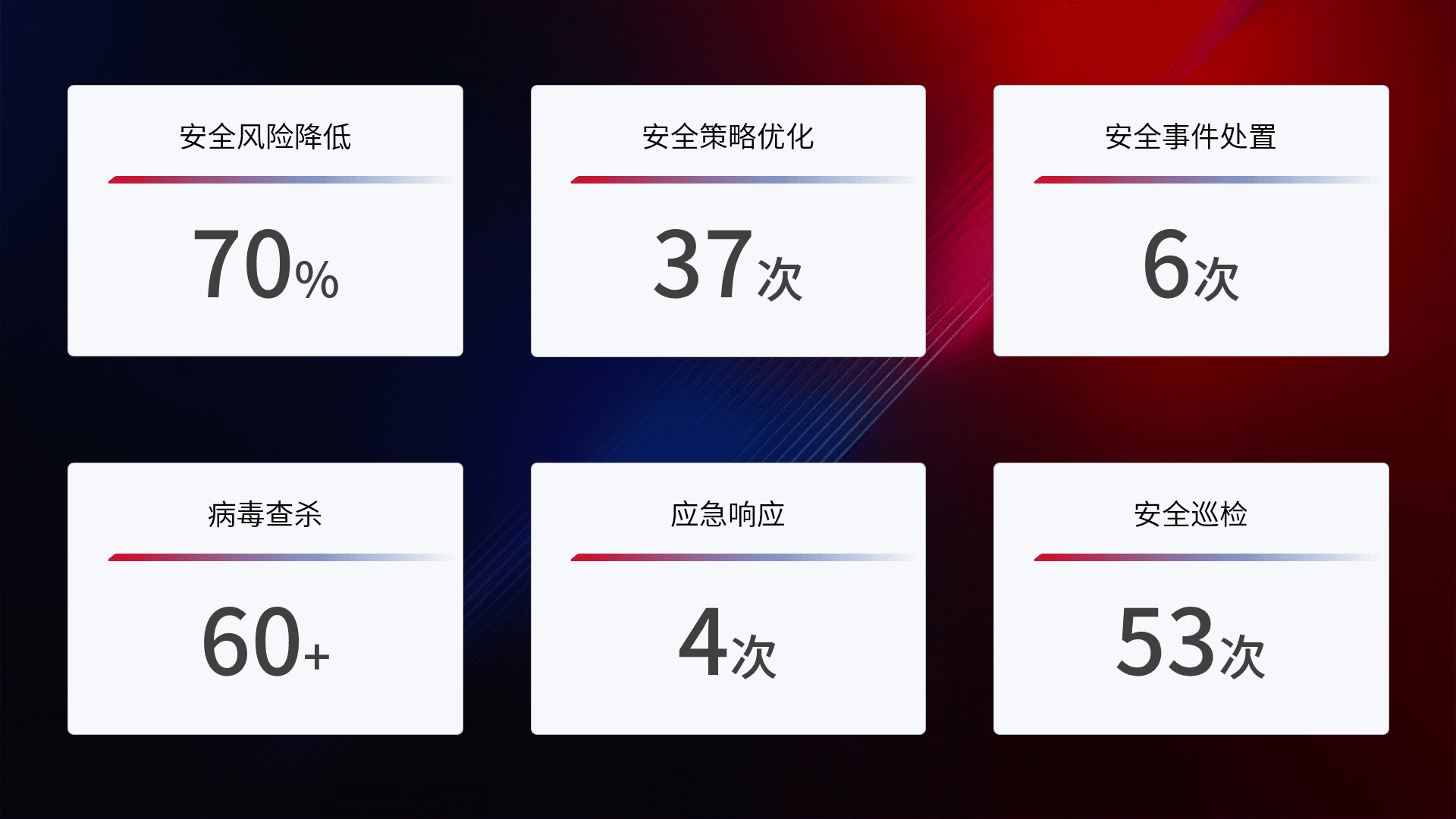 提供全面的安全事件报告体系,,包括处置报告、、、周报、、、、季度和年度总结,,,结合持续监控,,帮助客户深入了解网络安全状况。。。