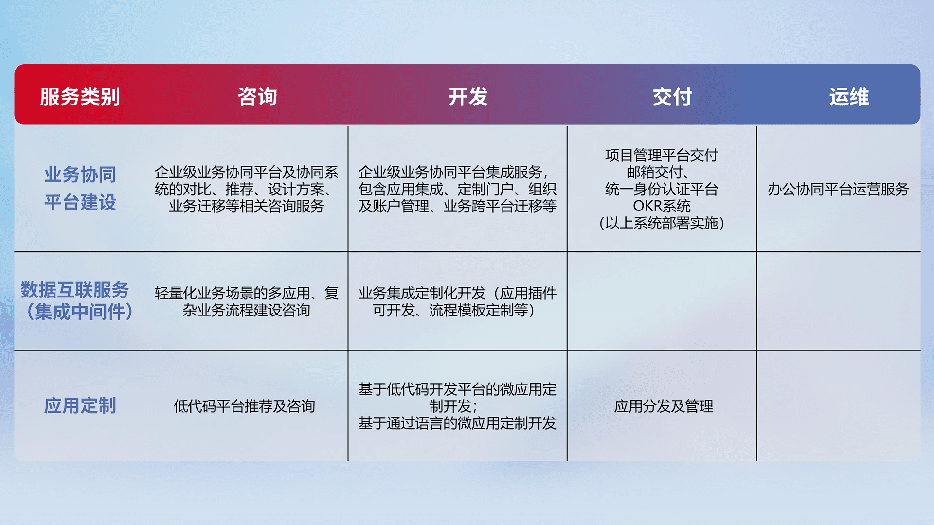 针对钉钉、、企微、、、IDaas等平台级产品提供产品的规划、、、、方案、、、、交付、、、定制化开发等服务,,,,实现如统一协同办公、、智能客户服务、、、、混合会议管理、、、、智能数据查询、、、等业务场景,,,实现数字化转型。。。
